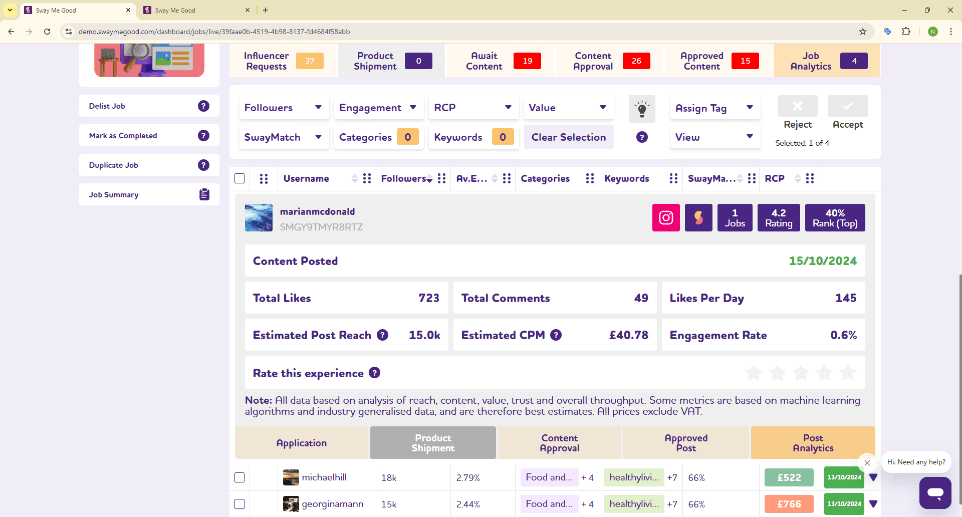 The Sway Me Good platform currently has 15,000 influencers who’ve proactively chosen to accept work through our platform. Their profiles are also well distributed, ranging from large headline influencers through to middle influencers and smaller, more niche influencers who are still growing their audience. Working with a combination of influencers like this helps to develop your brand recognition and appeal to social media algorithms.
