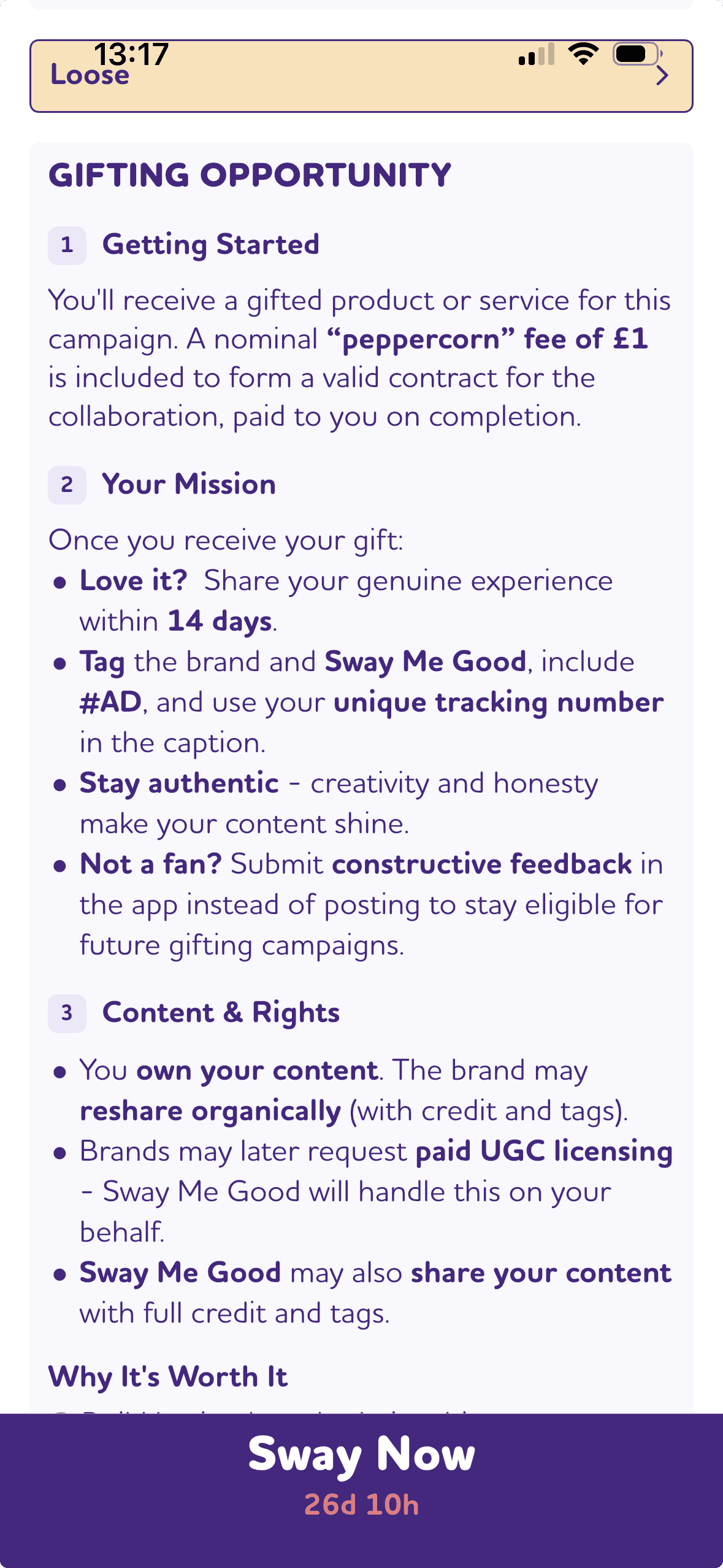 This release introduces Gifting campaigns. Build lasting brand relationships and get discovered through exposure and reposts. Enjoy free gifts and creative freedomโจand unlock UGC licensing for extra income.