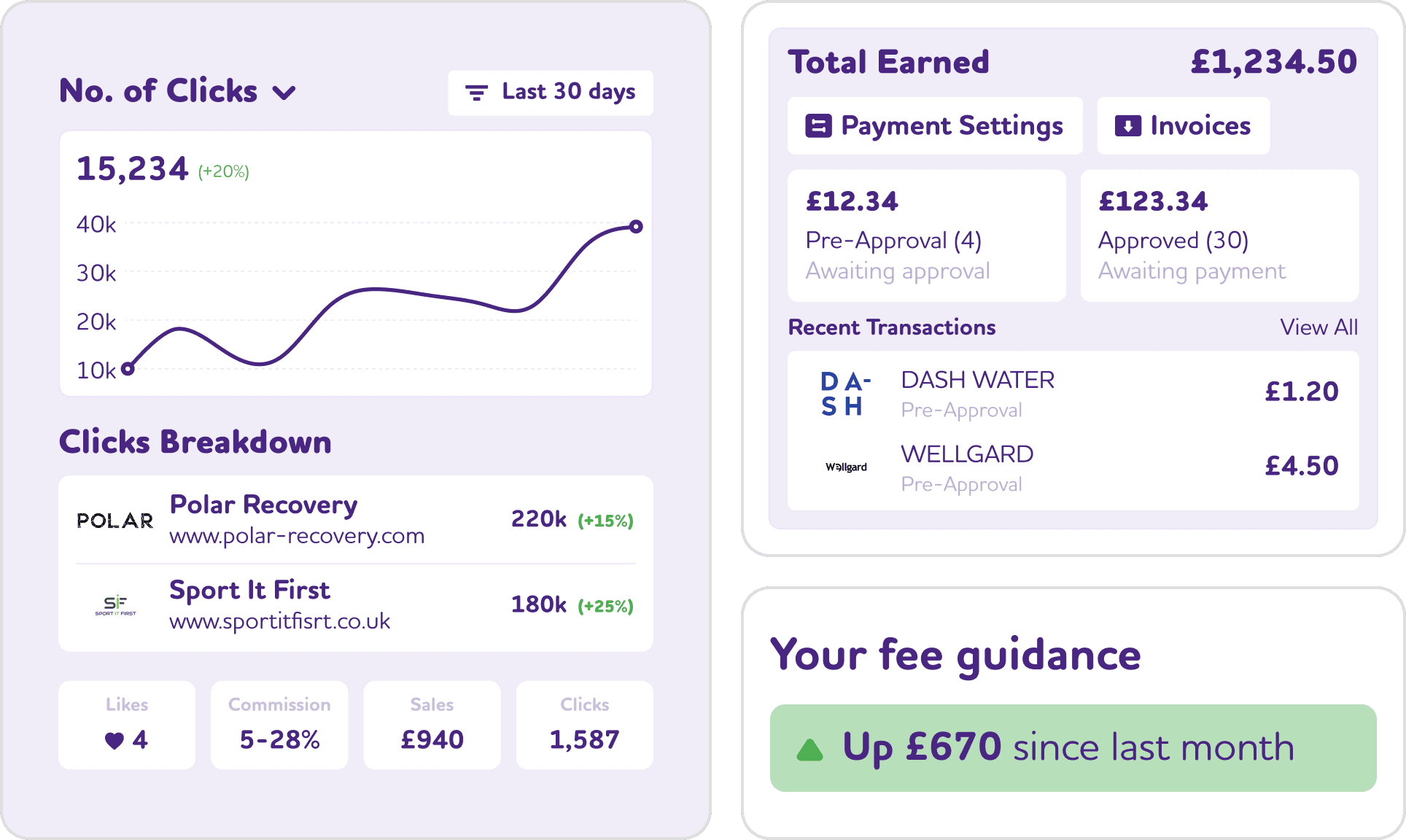 Track every click, sale and commission. See your impact in real time and get paid for your influence.