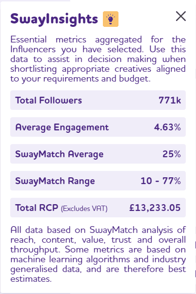Remove the silos. A good campaign will involve multiple influencers creating and posting in tandem. Use SwayInsights to package up groups of influencers to calculate total cost, average engagement and expected outcomes.