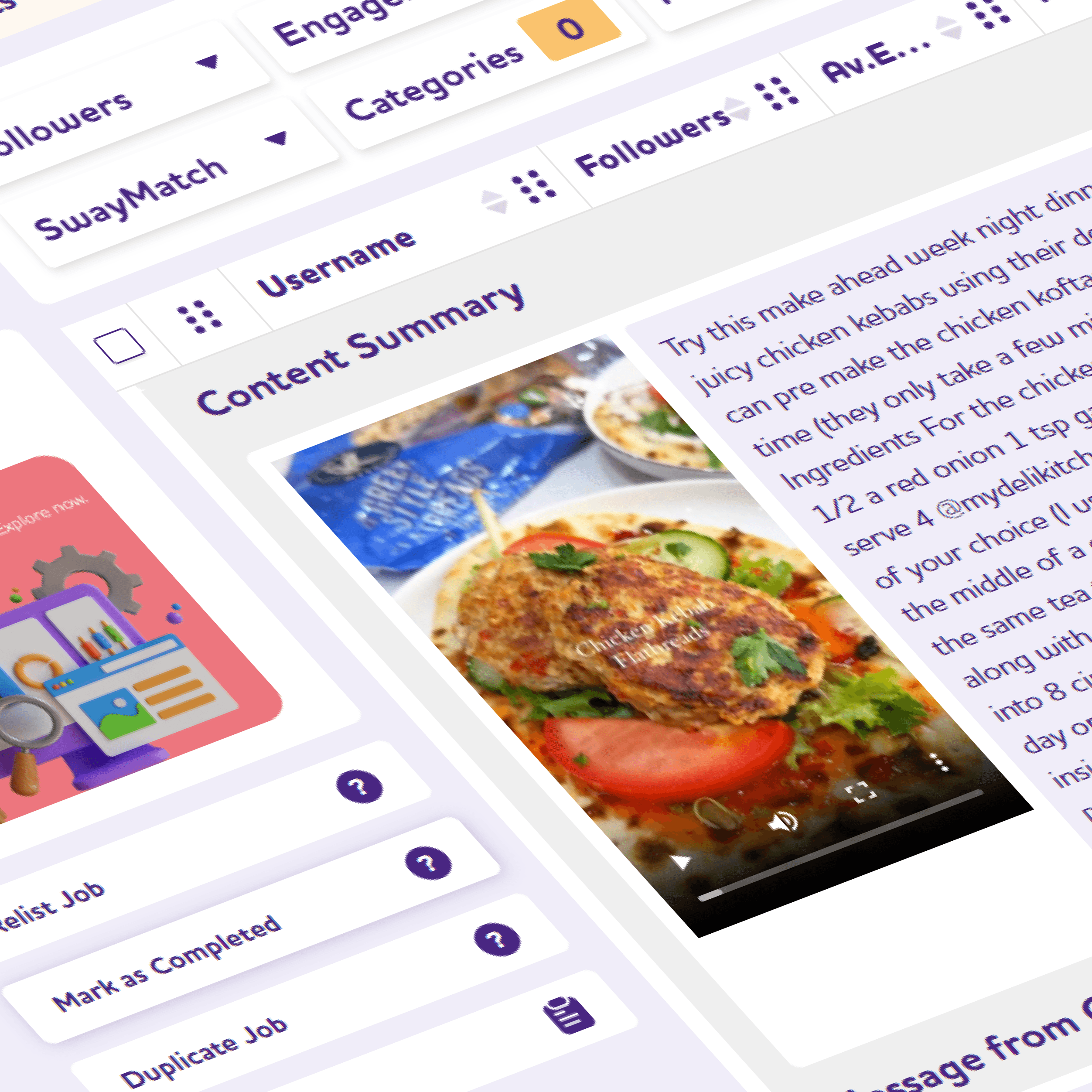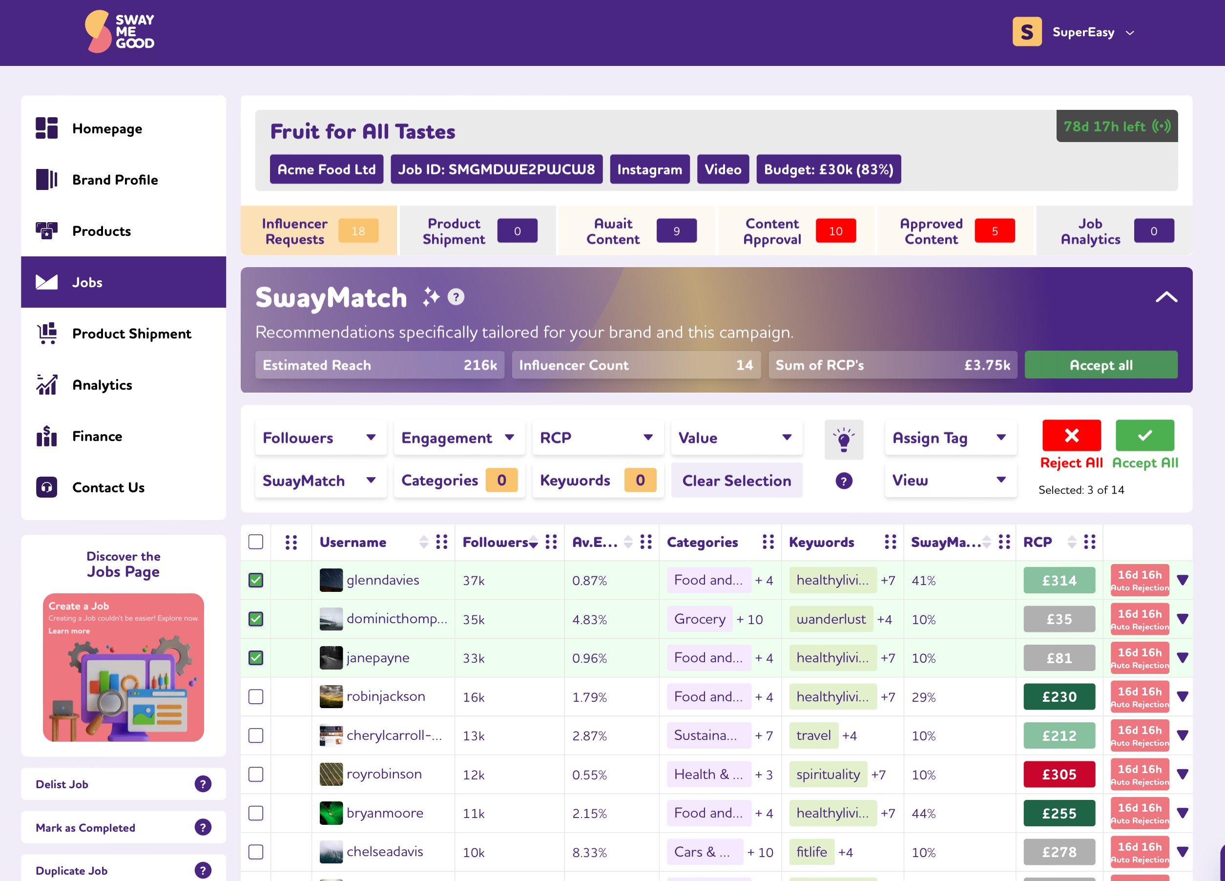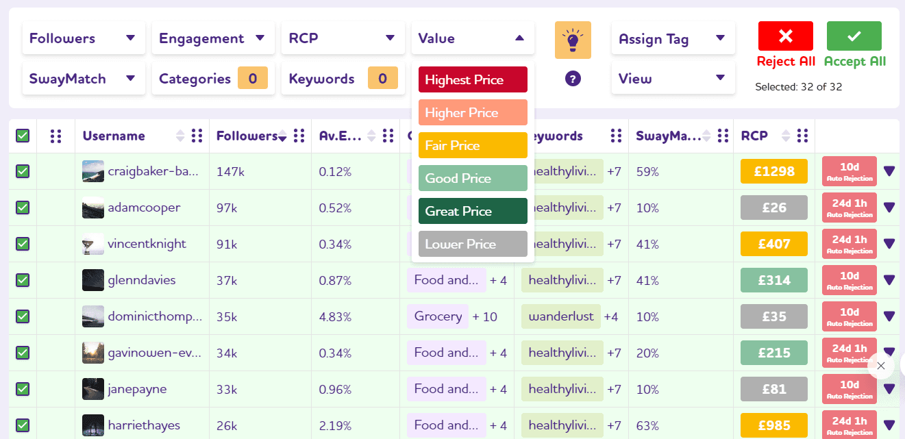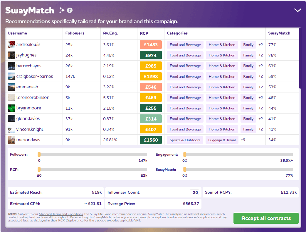 Work smarter, not harder. SwayMatch AI rates each influencer against how they match up with your brand, product, job requirements and brief. Ratings are displayed as percentages with 100% being a perfect match. This cuts down the time spent selecting the ideal creators.